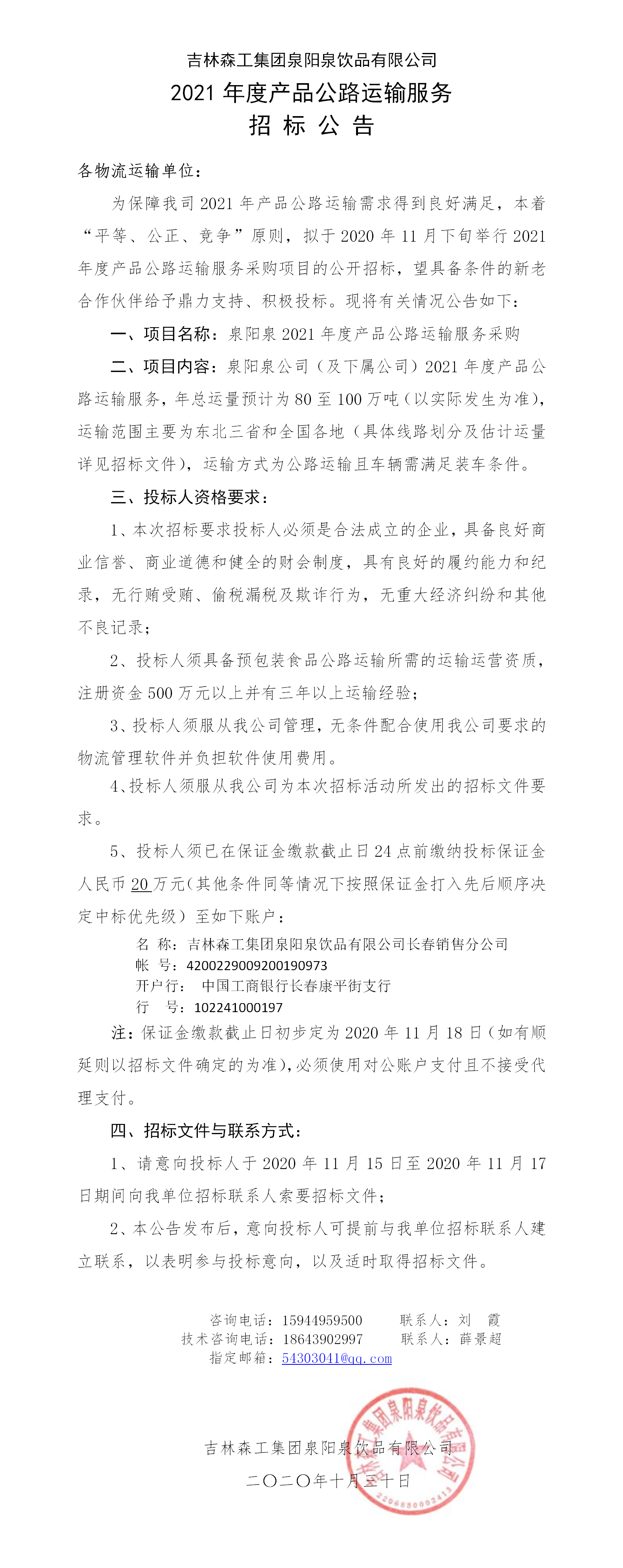 2021年度產(chǎn)品公路運(yùn)輸服務(wù)招標(biāo)公告